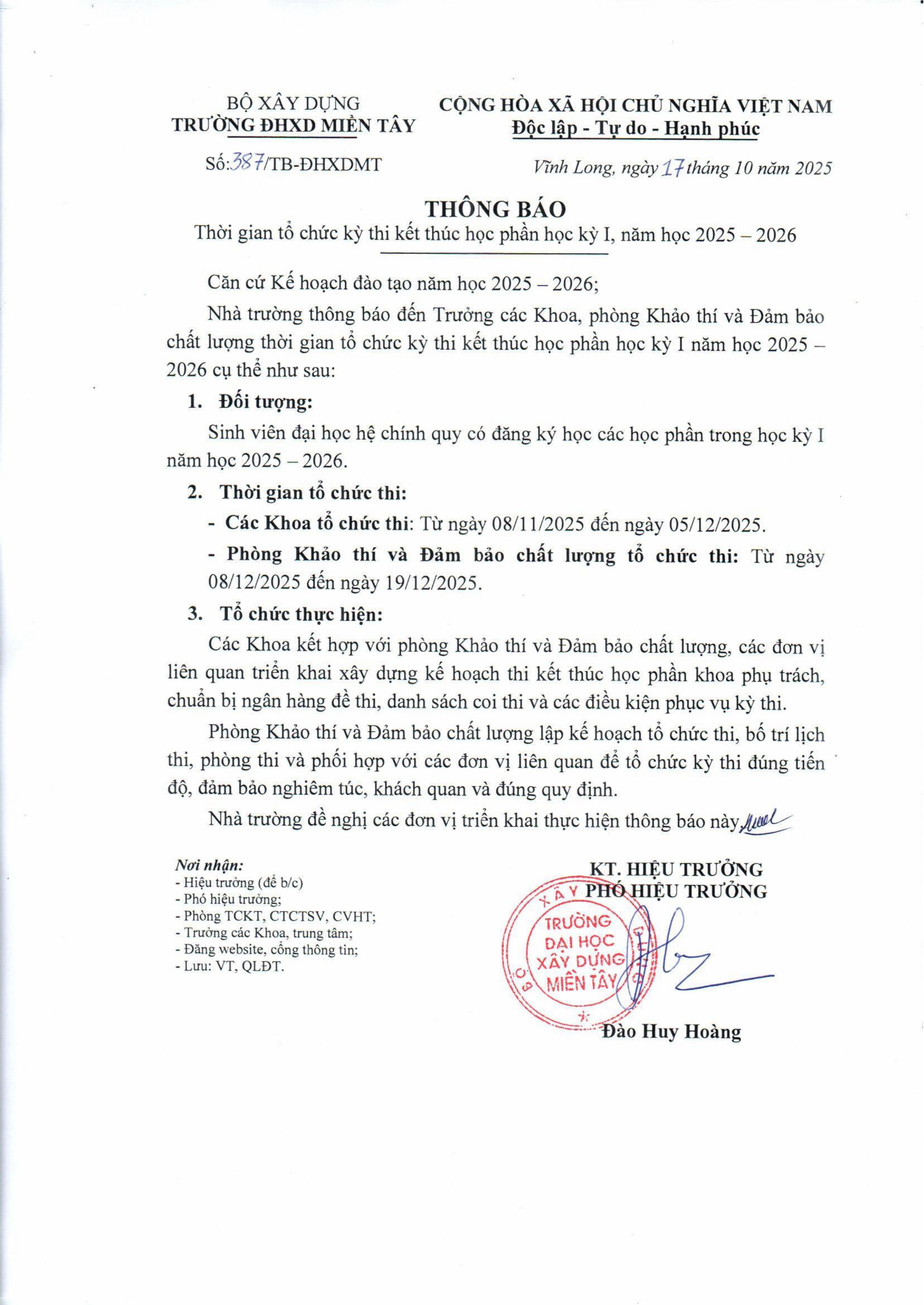 Thông báo Thời gian tổ chức kỳ thi kết thúc học phần học kì I, năm học 2025-2026