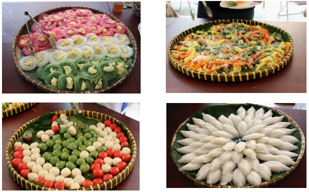 quê quen thuộc. Từng mâm bánh được bày biện khéo léo, rực rỡ sắc màu, vừa gần