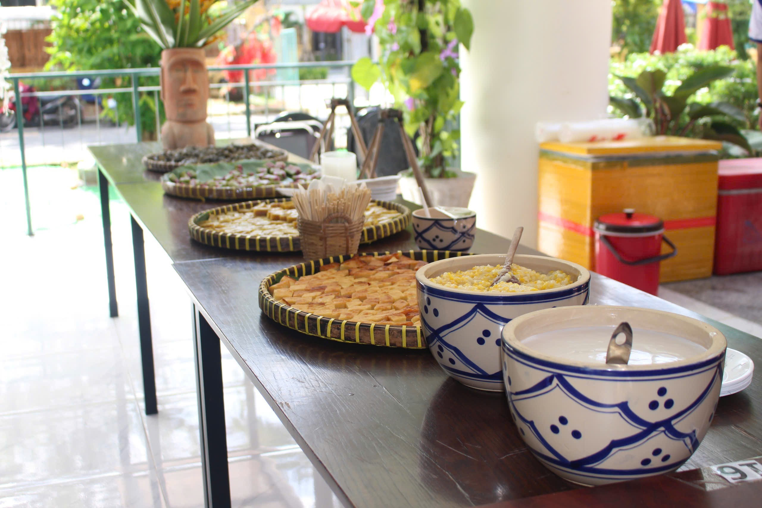 gian buffet bánh được trang trí giản dị nhưng tinh tế, tái hiện hình ảnh chợ