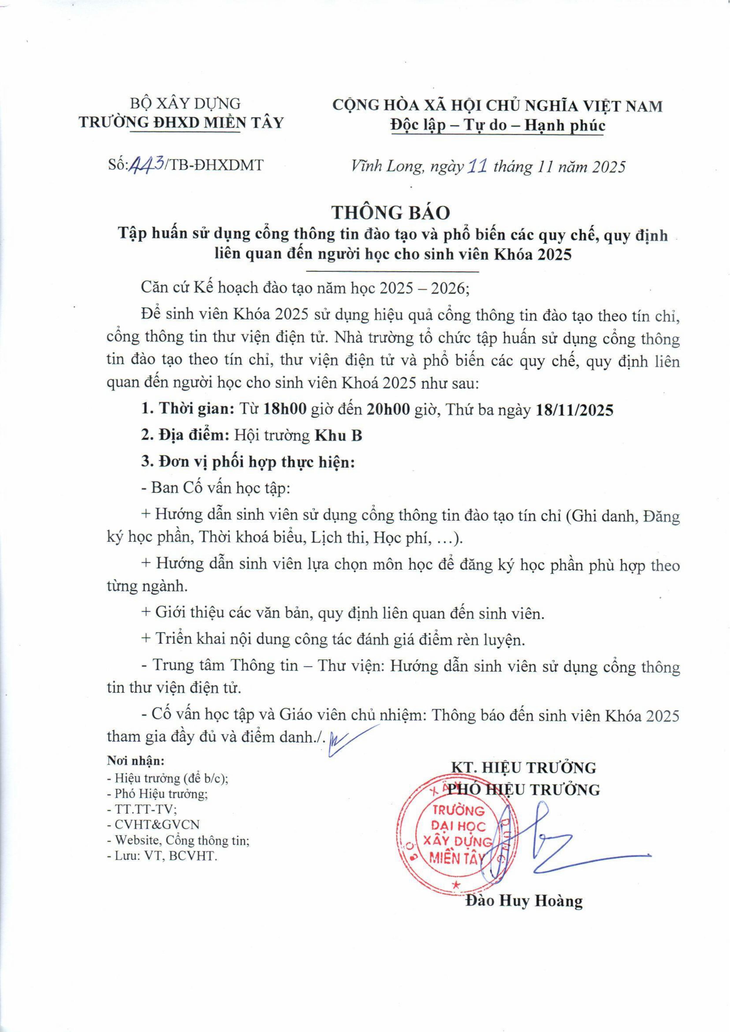 Thông báo tập huấn sử dụng cổng thông tin đào tạo và phổ biến các quy chế, quy định liên quan đến người học cho sinh viên Khóa 2025