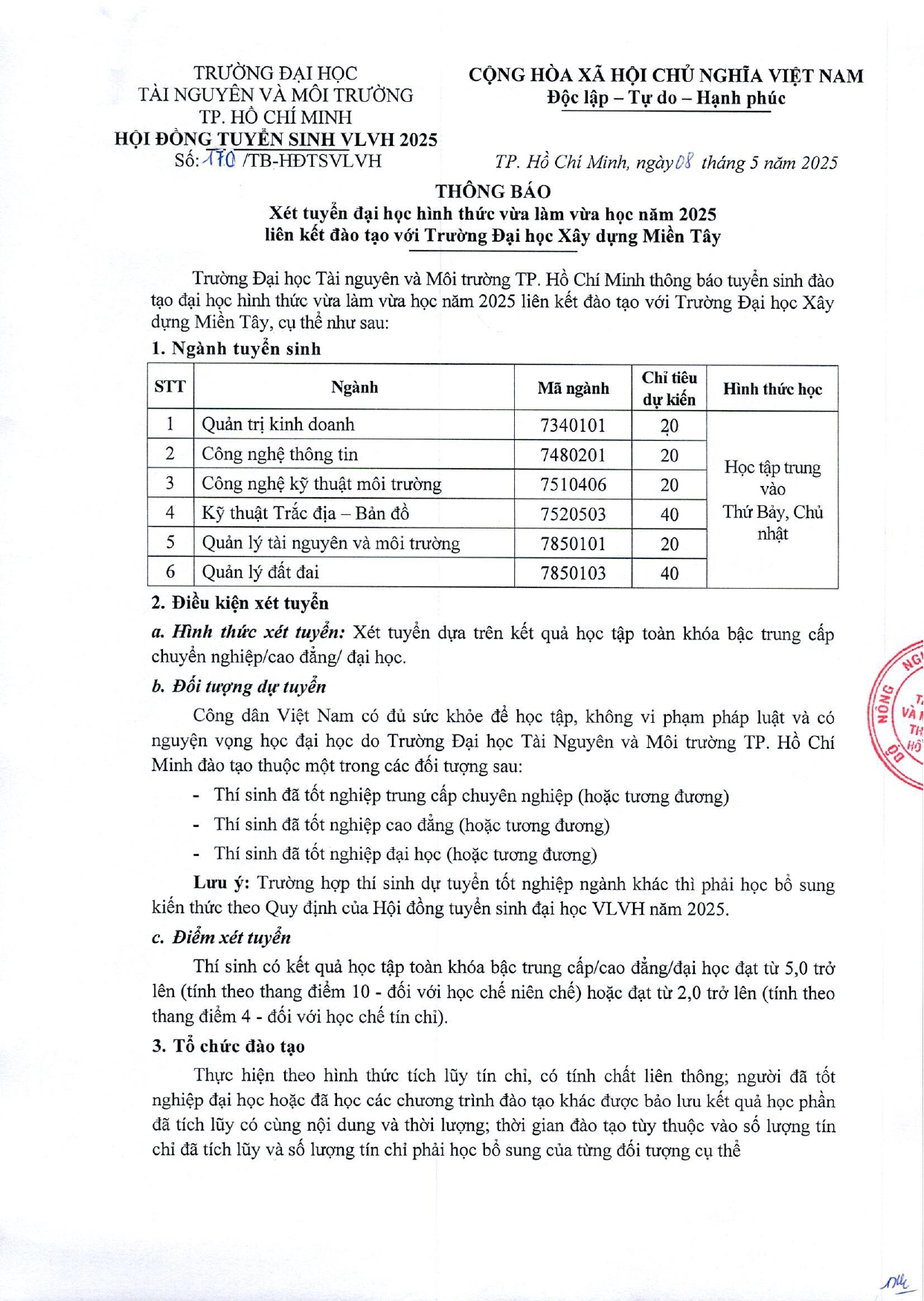 Trường Đại học Tài nguyên và Môi trường TP.HCM thông báo xét tuyển sinh đại học hình thức vừa làm vừa học năm 2025 liên kết đào tạo với Trường ĐHXD Miền Tây