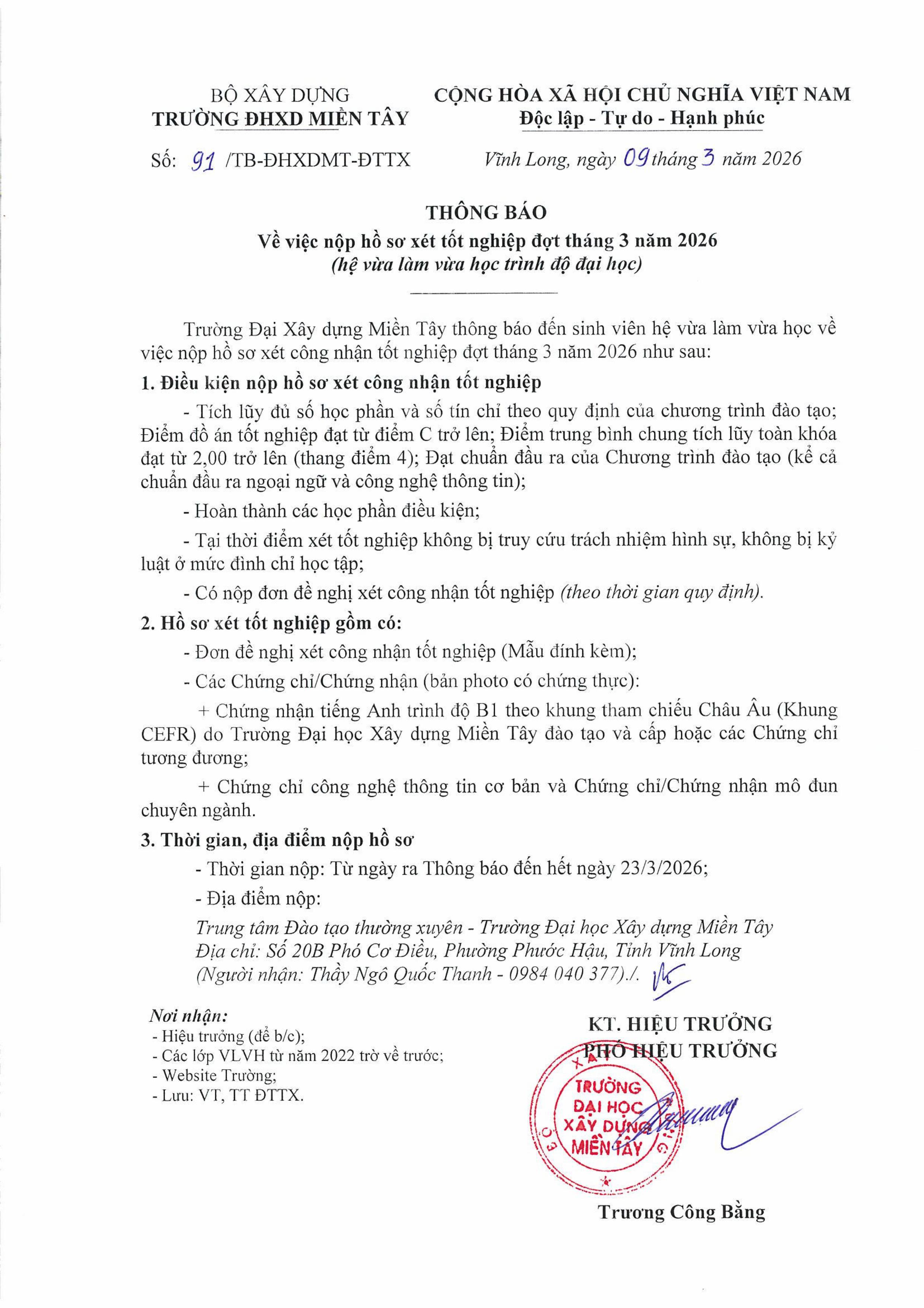 Thông báo về việc nộp hồ sơ xét tuyển tốt nghiệp đợt tháng 3 năm 2026 (hệ vừa làm vừa học trình độ đại học)