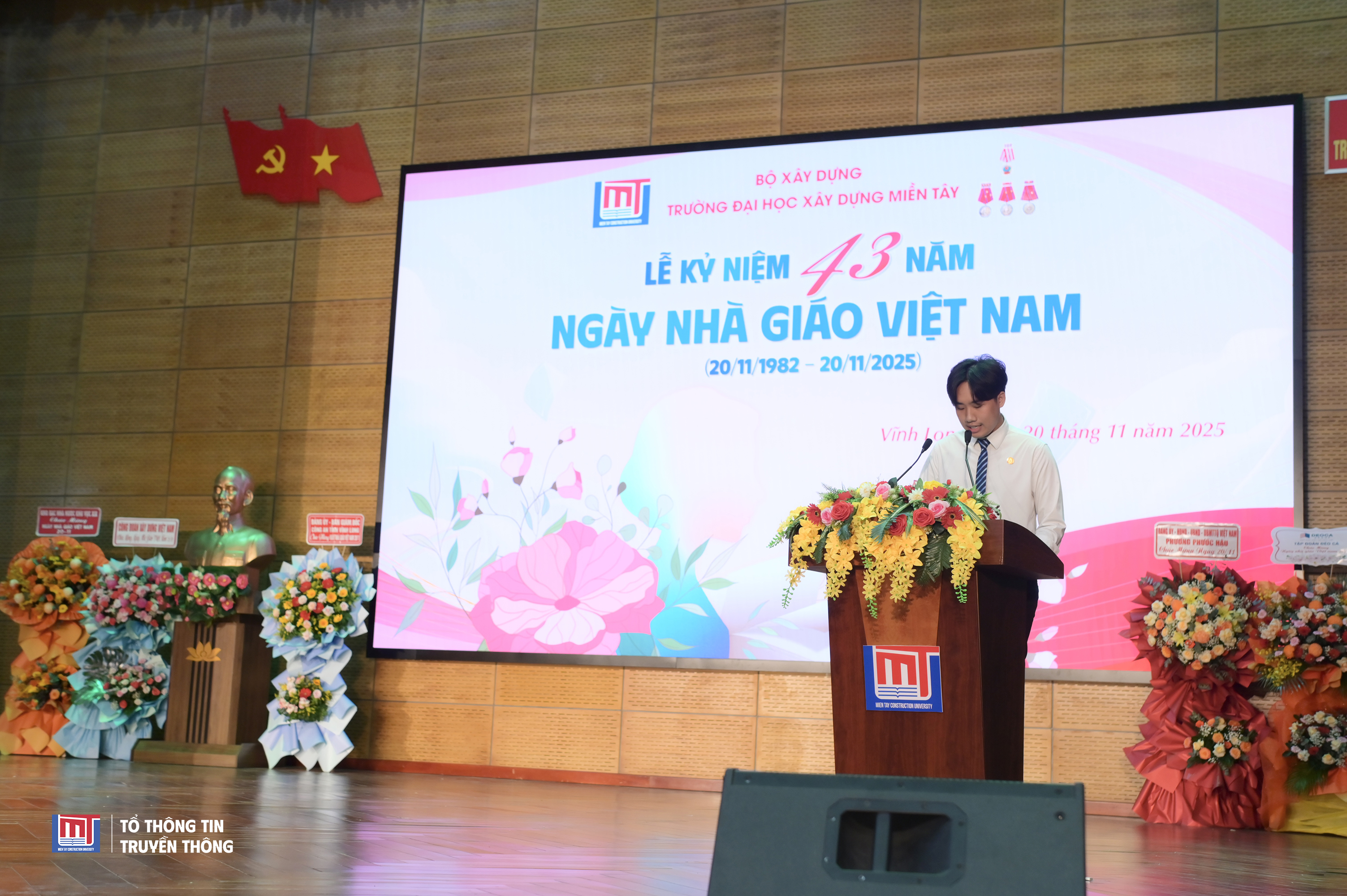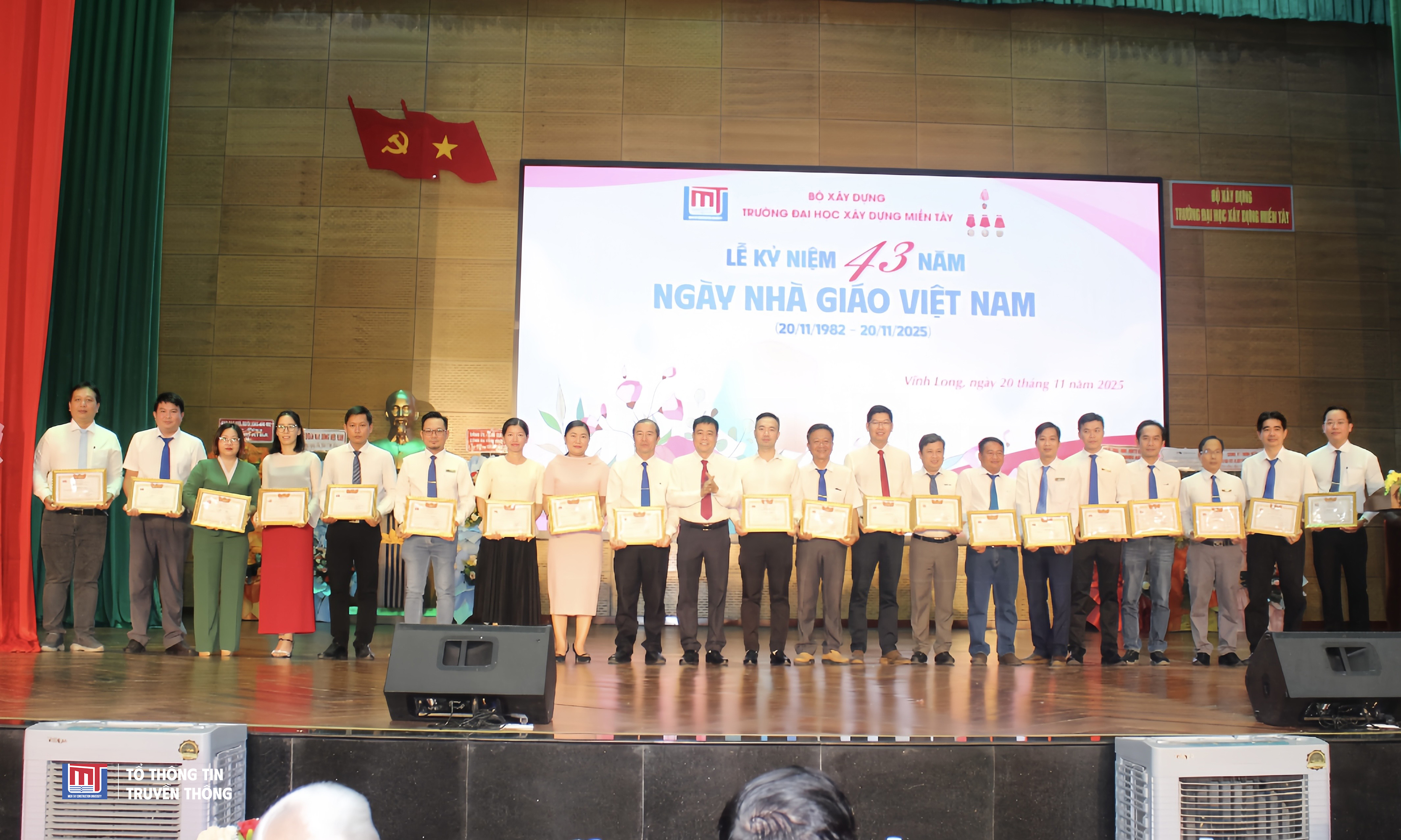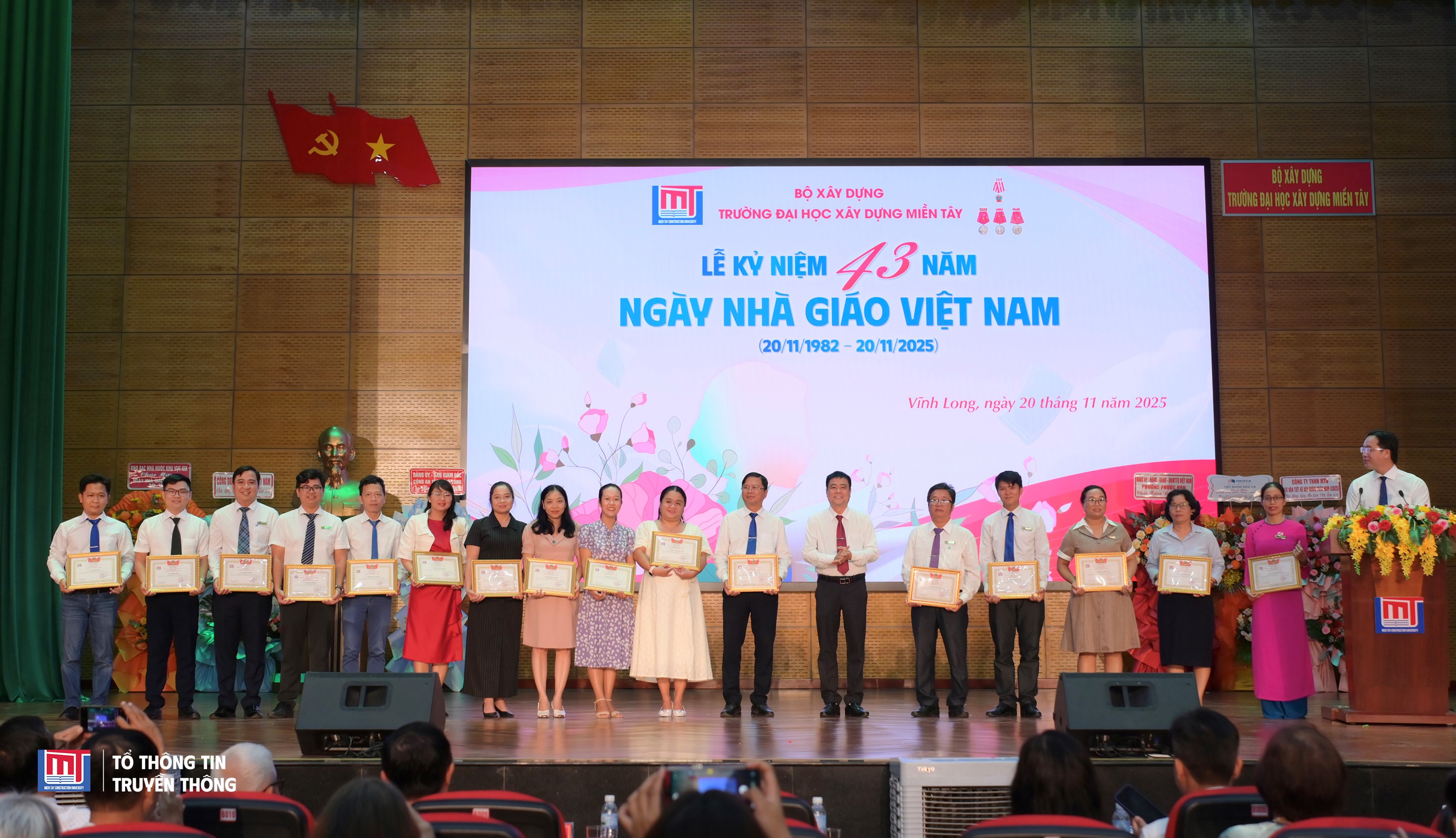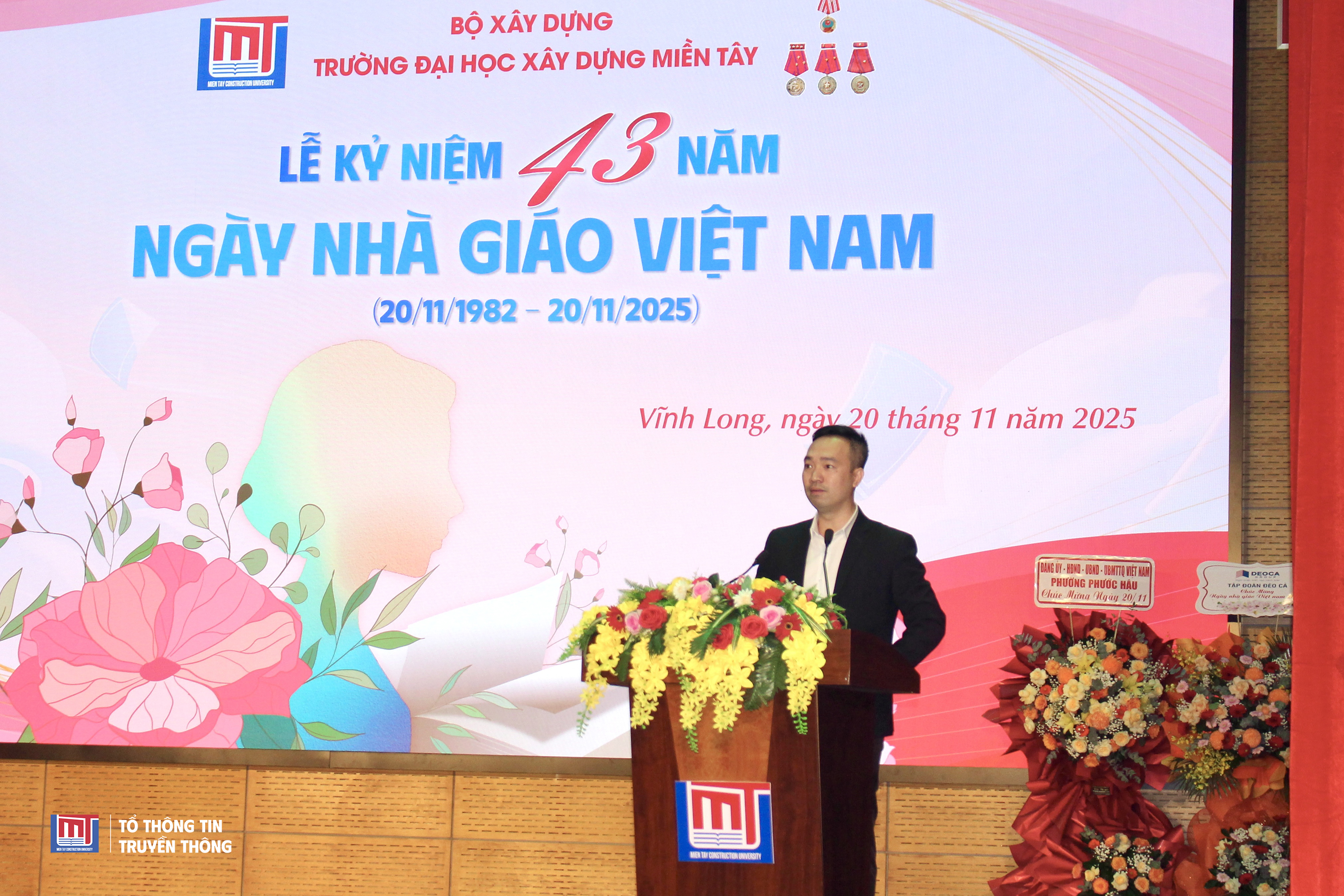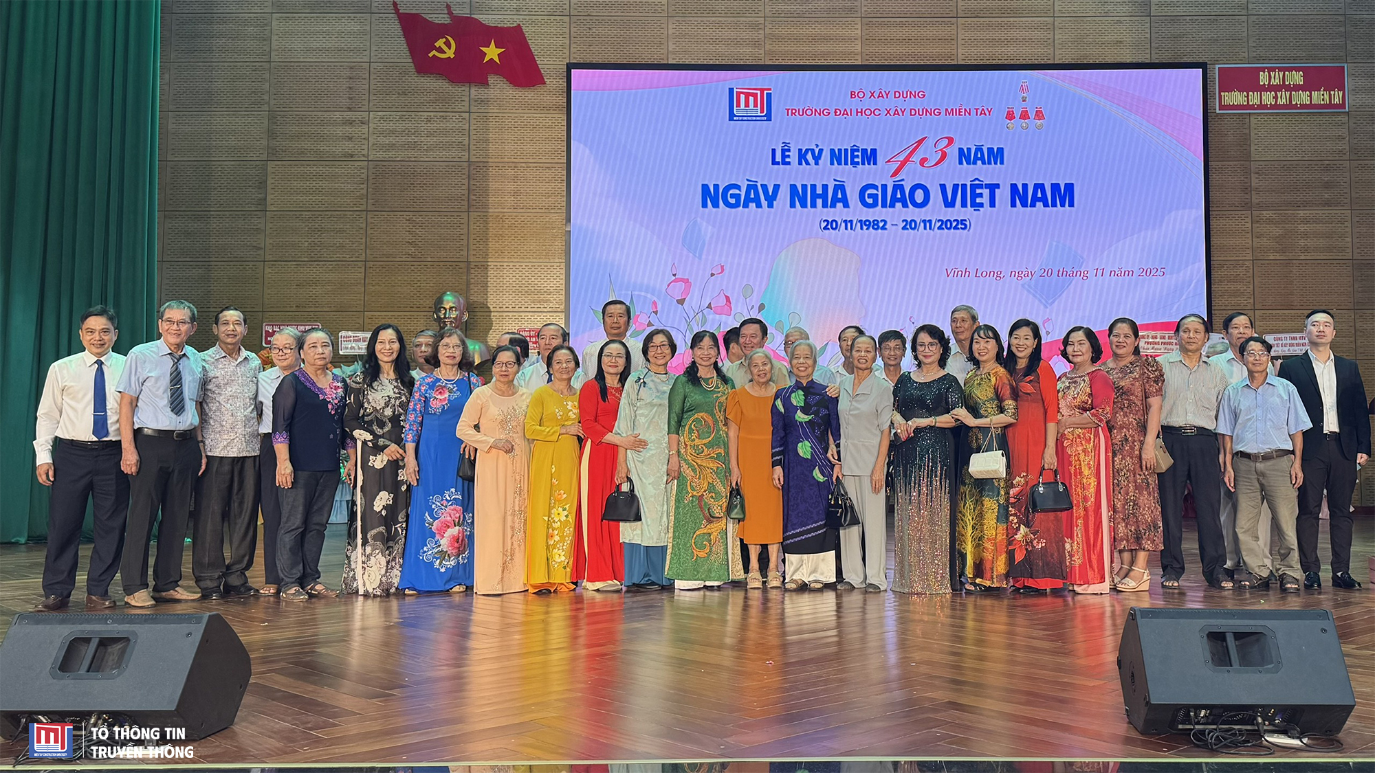 Sáng ngày 20/11/2025, Trường Đại học Xây dựng Miền Tây long trọng tổ chức Lễ kỷ niệm Ngày Nhà giáo Việt Nam 20/11. Buổi lễ có sự tham dự của đại biểu khách mời, toàn thể cán bộ, viên chức, người lao động, cùng tân sinh viên khóa 2025 và sinh viên tiêu biểu đại diện sinh viên toàn Trường.