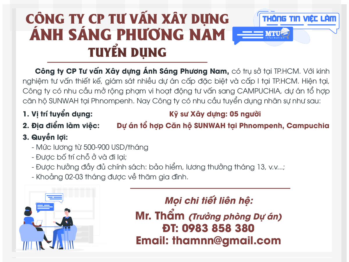 Công TY CP Tư vấn Xây dựng Ánh Sáng Phương Nam tuyển dụng Kỹ sư Xây dựng làm việc tại Campuchia
