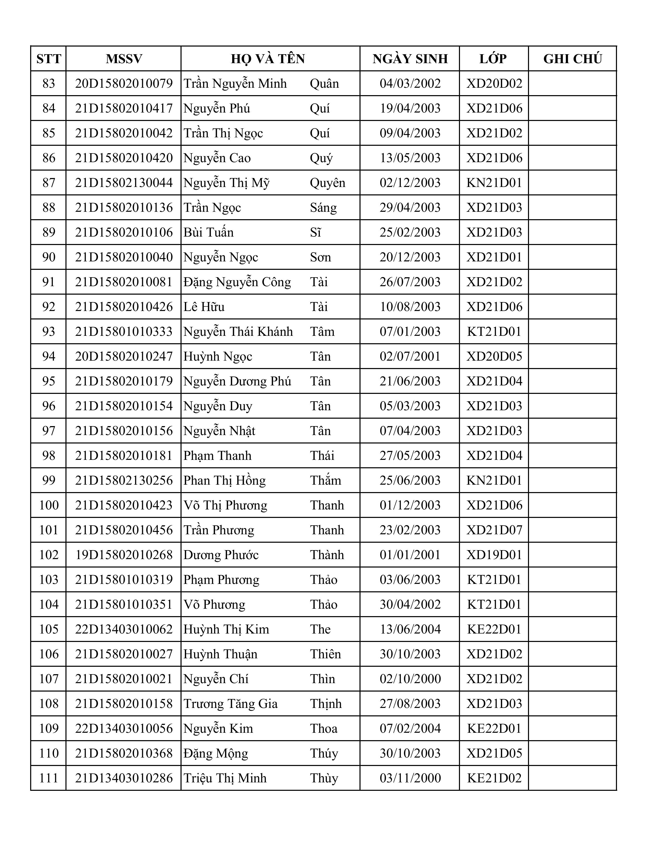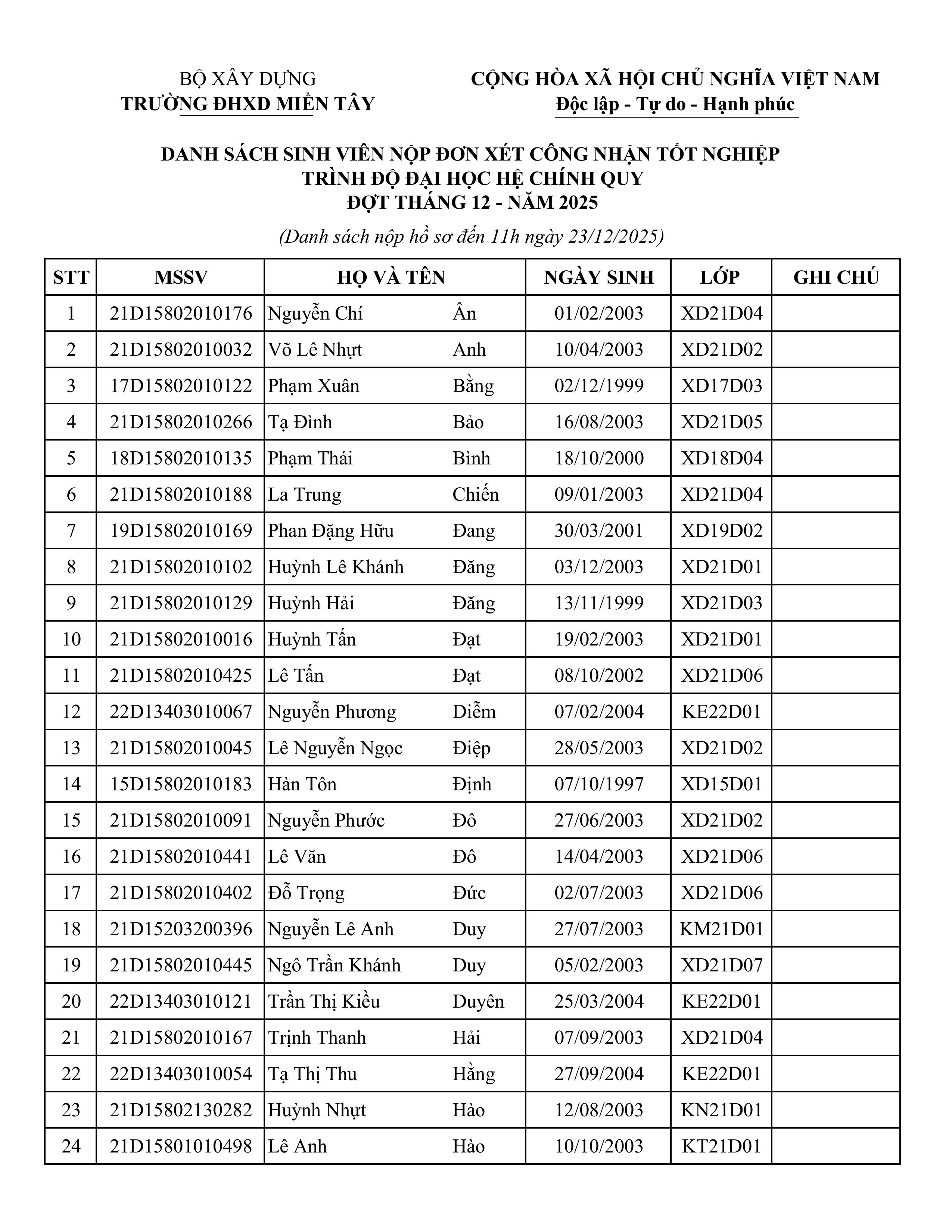 Danh sách SV nộp đơn xét công nhận tốt nghiệp đợt tháng 12 năm 2025