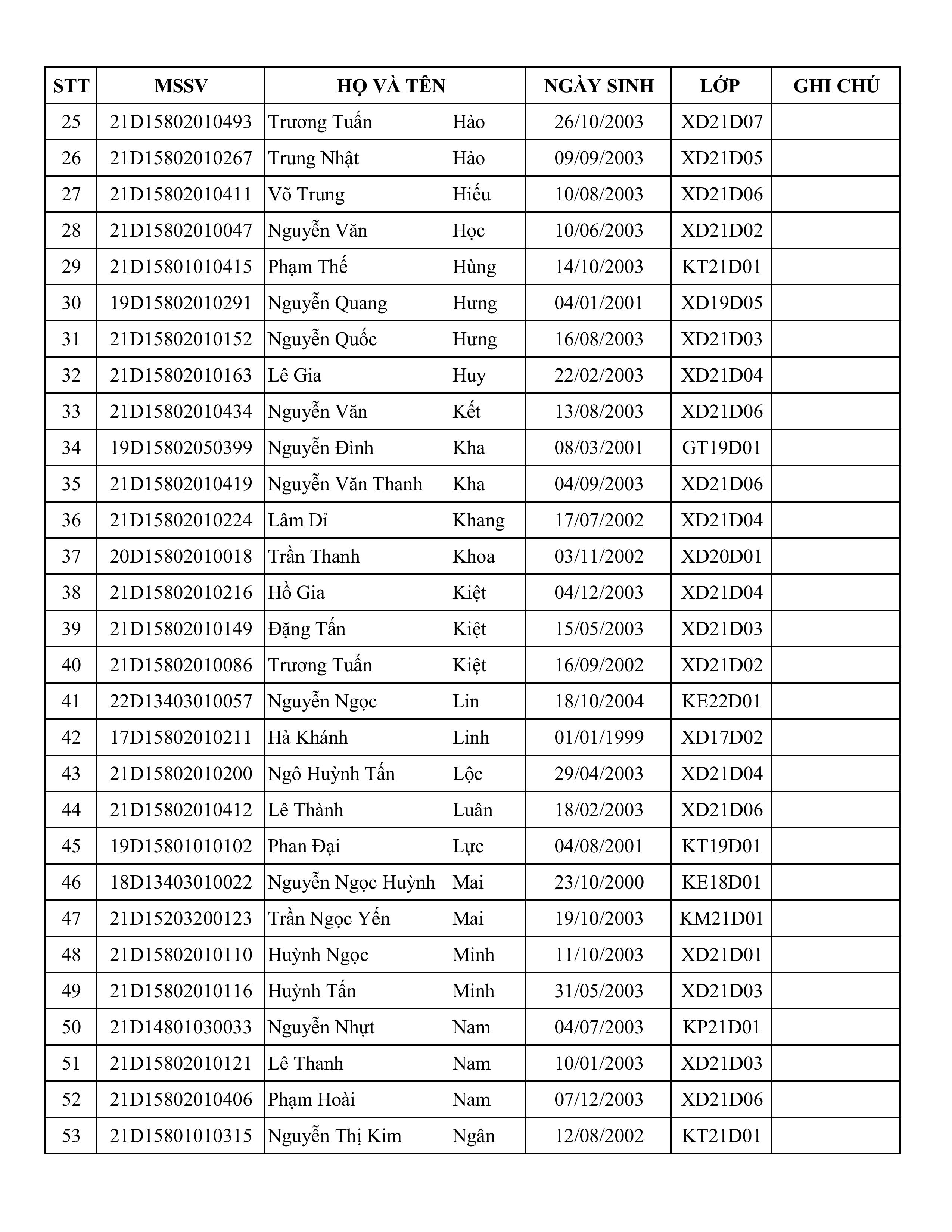 Công nhận danh sách sinh viên đủ điều kiện giao đồ án tốt nghiệp (Lớp GT22D01-VL, Ngành Kỹ thuật Xây dựng Công trình Giao thông)
