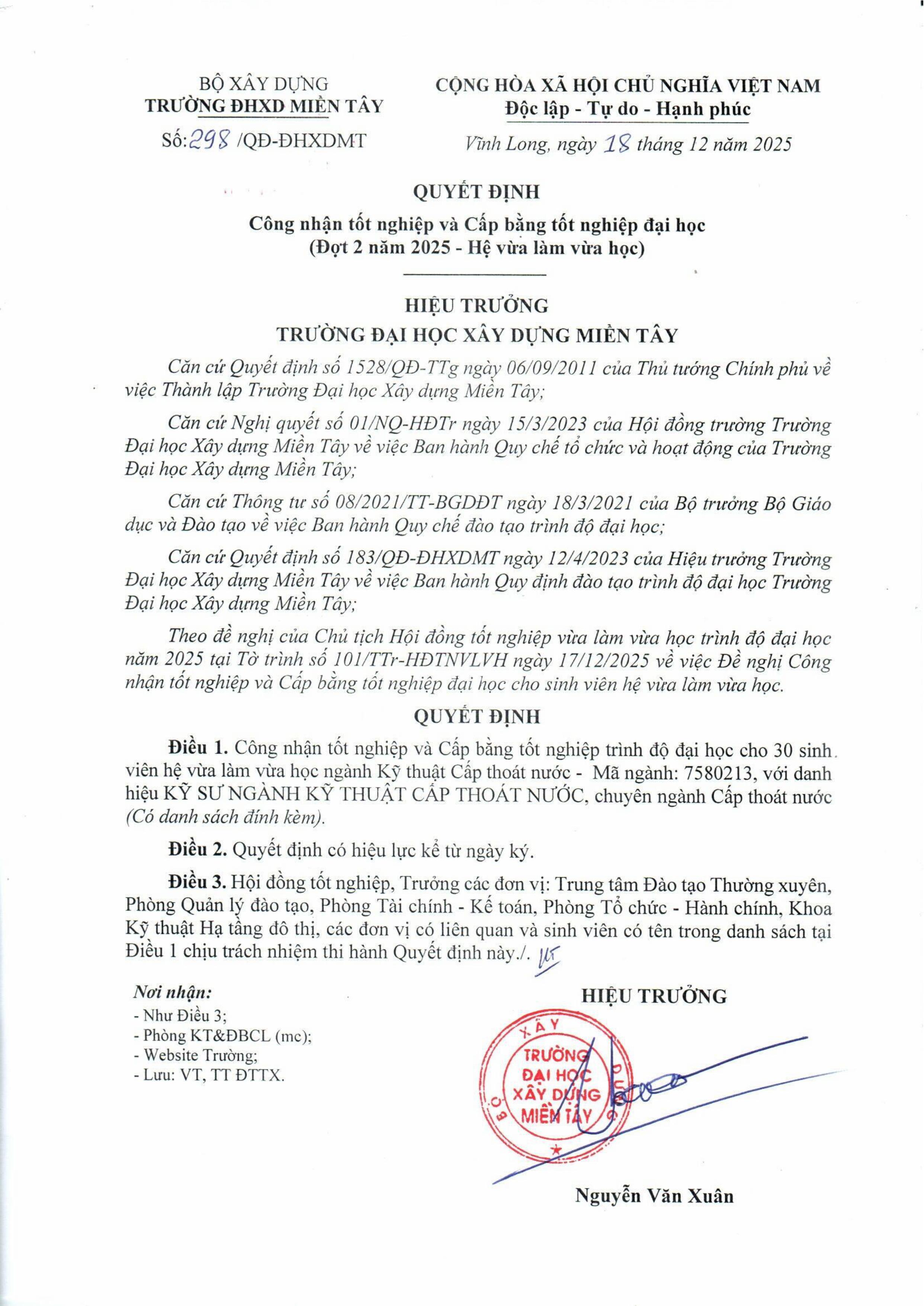 Quyết định công nhận tốt nghiệp và Cấp bằng TN (VLVH - 8 SV)