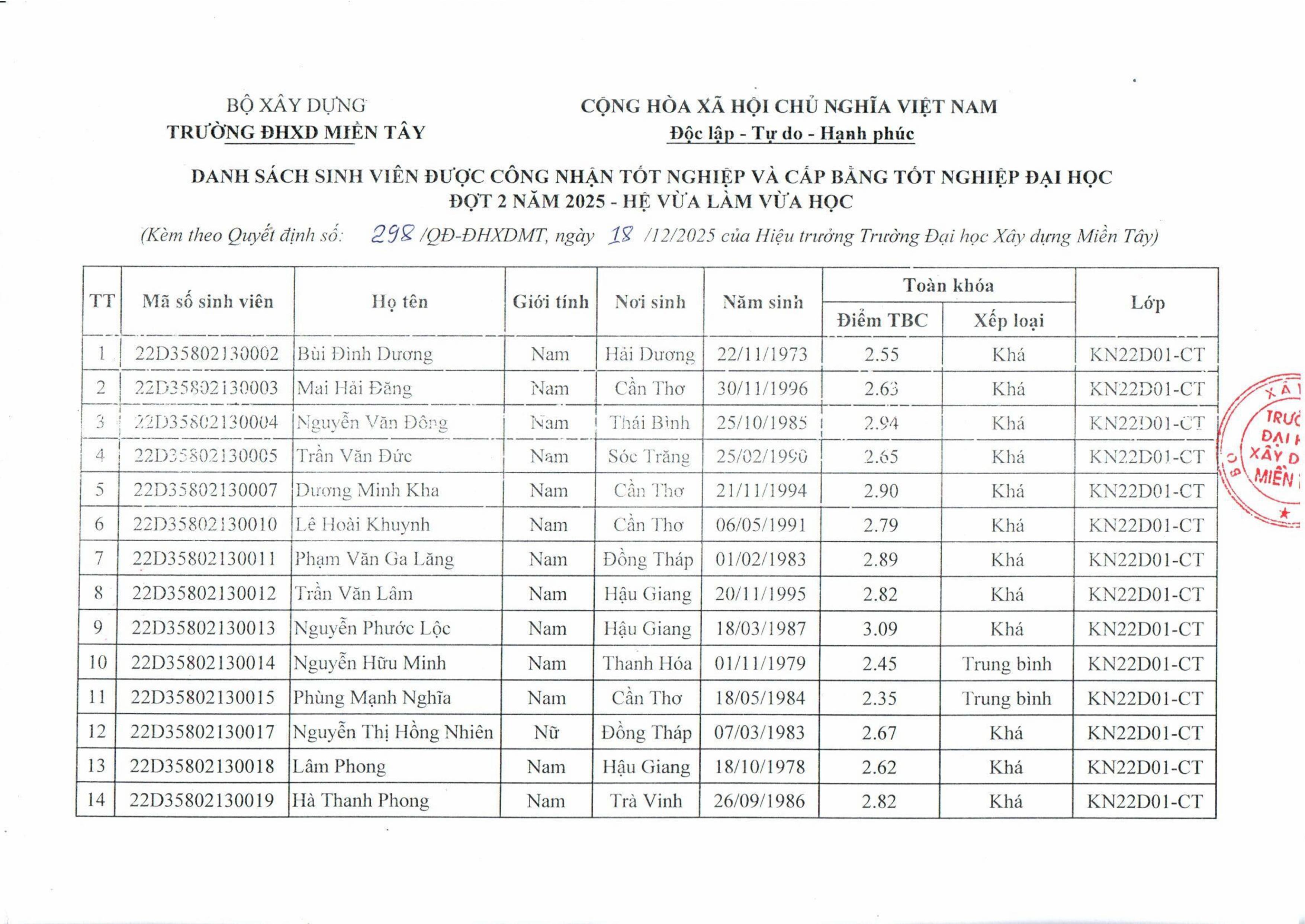 Công nhận danh sách sinh viên đủ điều kiện giao đồ án tốt nghiệp (Lớp GT22D01-VL, Ngành Kỹ thuật Xây dựng Công trình Giao thông)