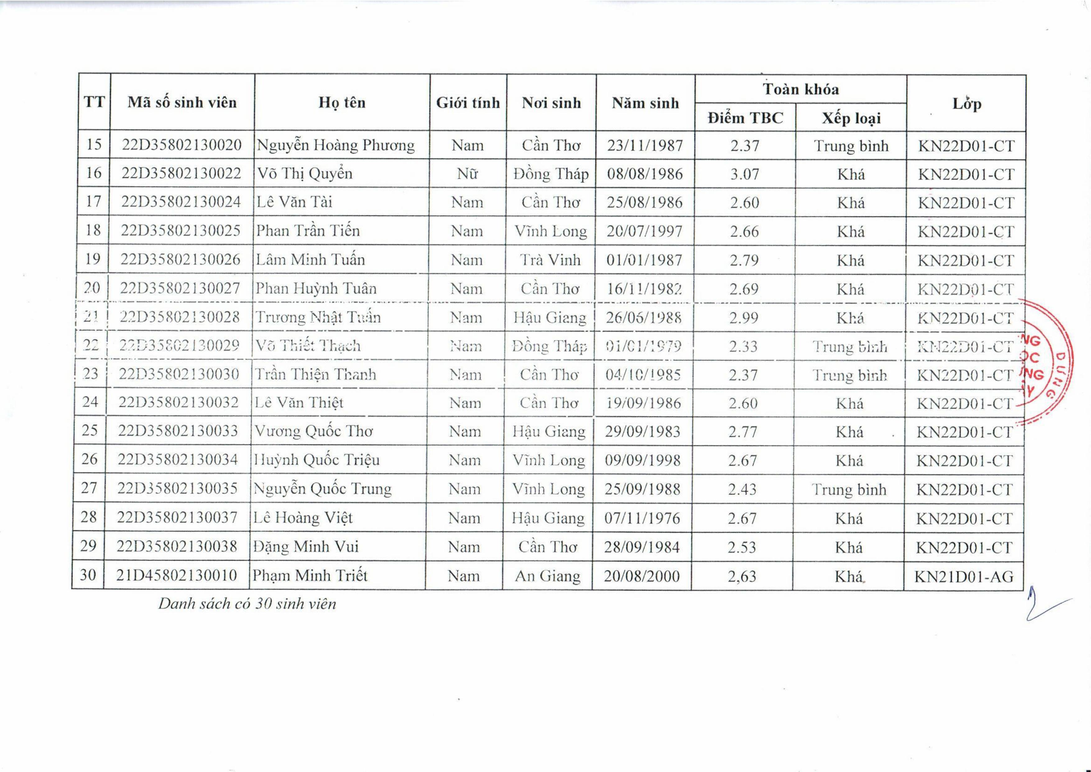 Quyết định công nhận danh sách SV đủ điều kiện giao ĐATN lớp KN22D01-CT - VLVH