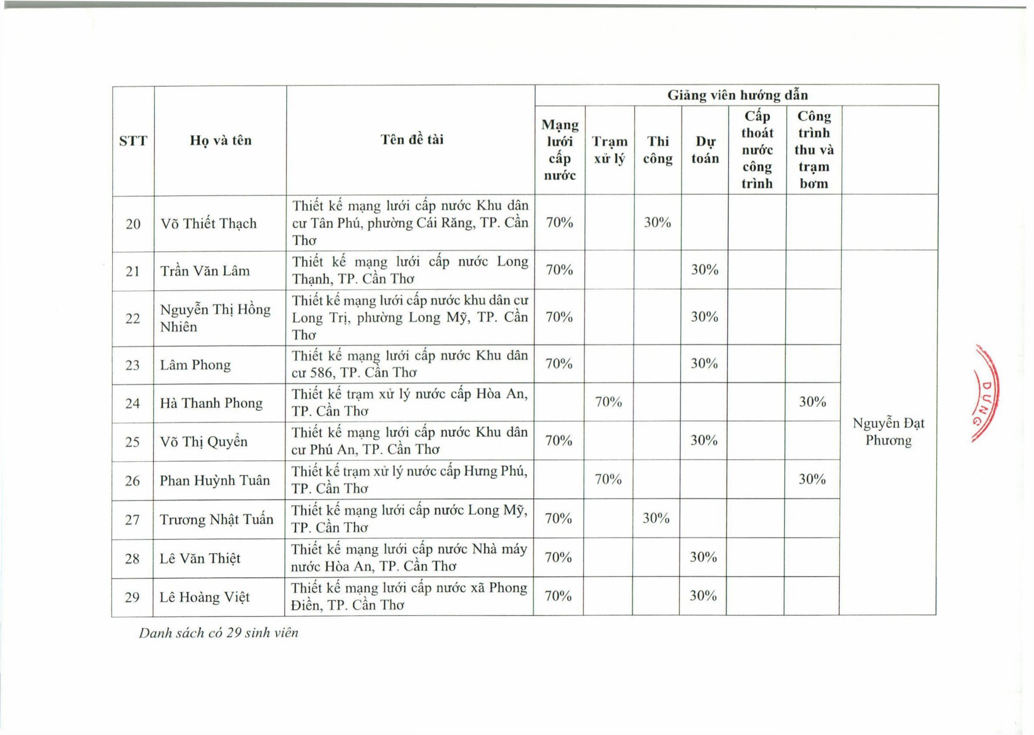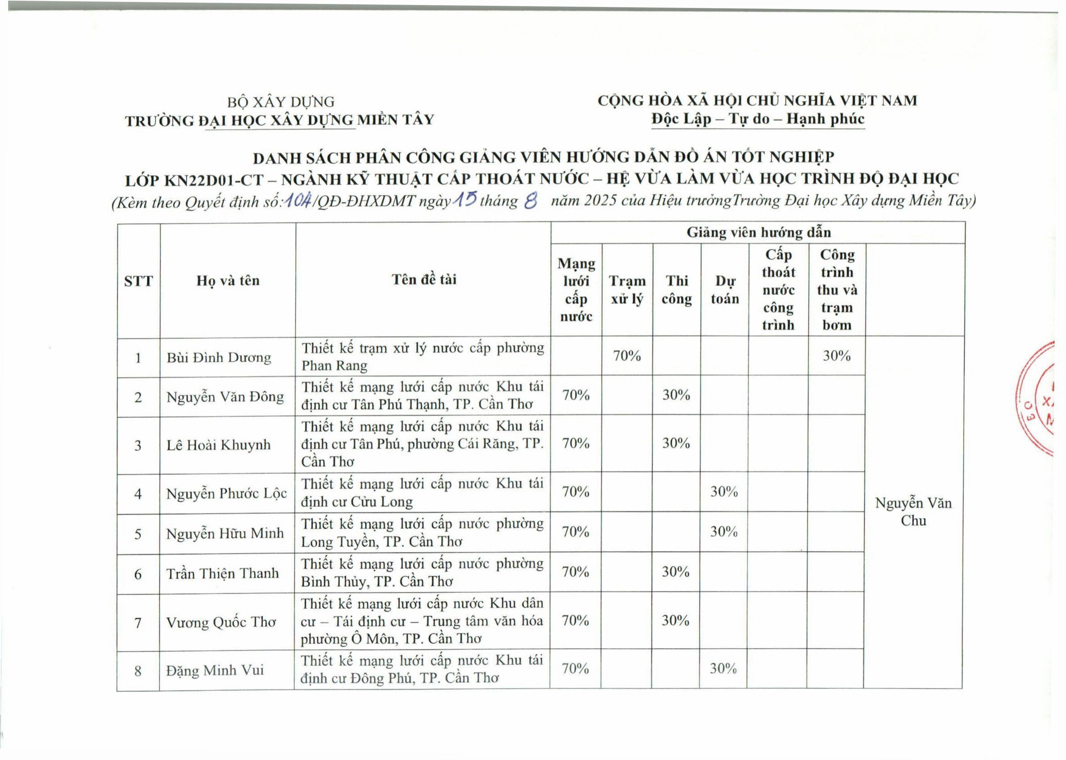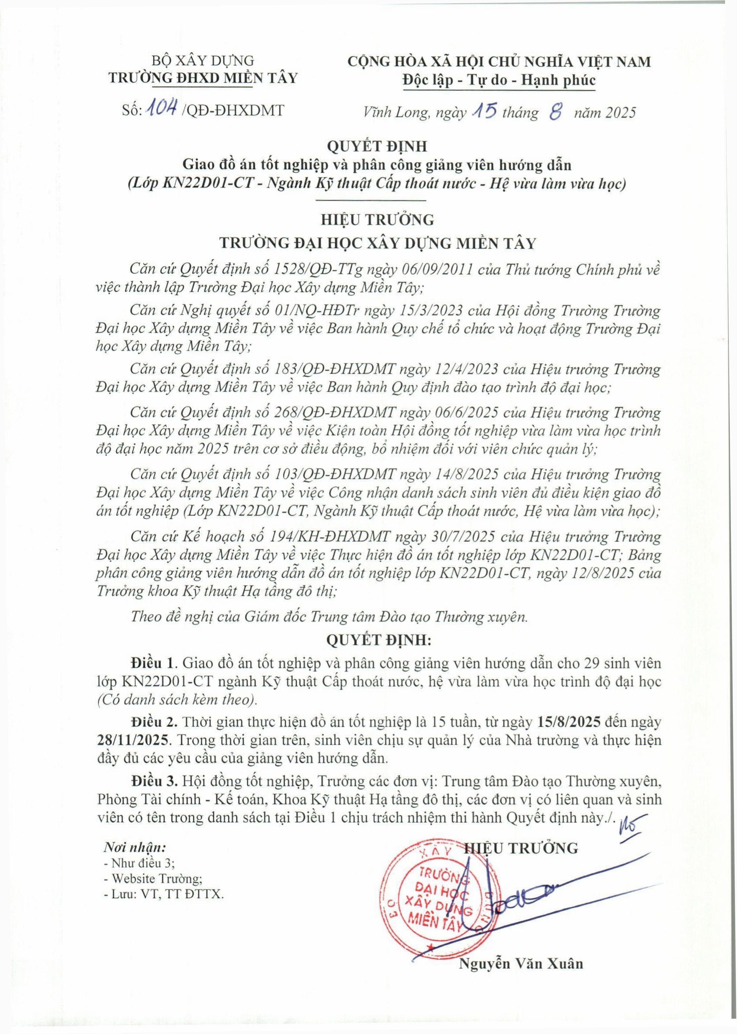 QUYẾT ĐỊNH Giao đồ án tốt nghiệp và phân công giảng viên hướng dẫn (Lớp KN21D01-AG, Ngành Kỹ thuật Cấp thoát nước)