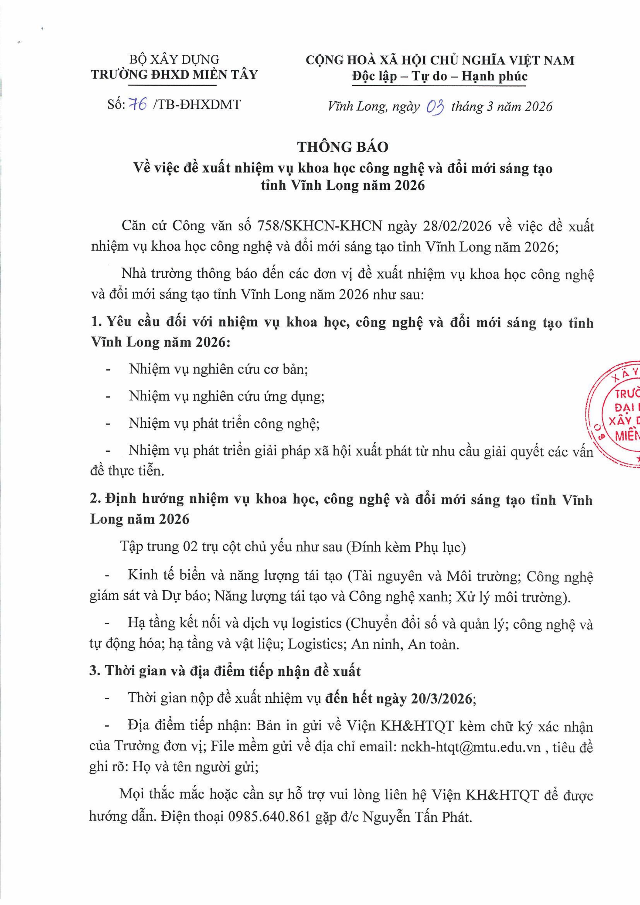 Thông báo Về việc viết bài cho Tạp chí Khoa học và Công nghệ Trường Đại học Xây dựng Miền Tây số 16 năm 2026