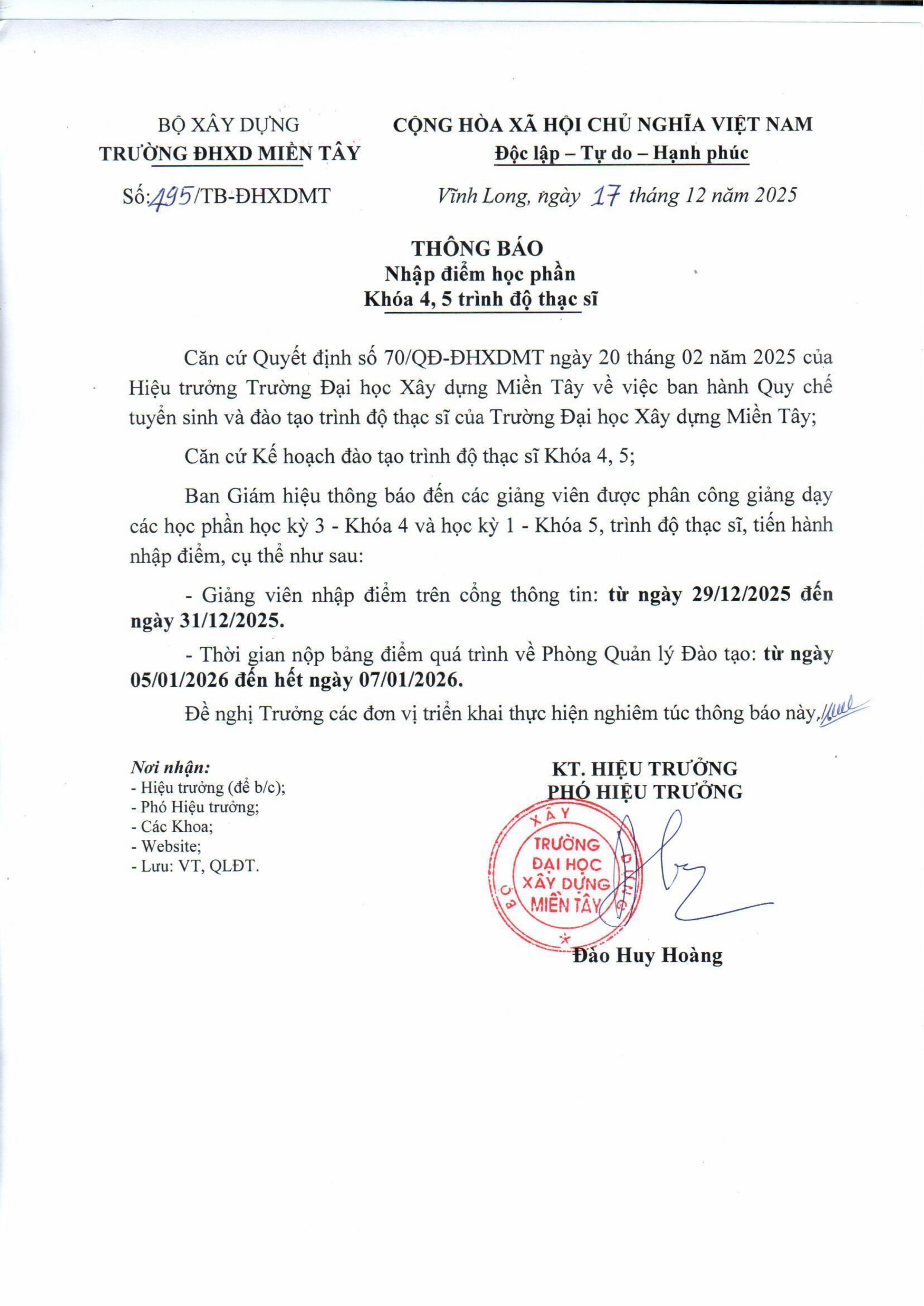 Thông báo nhập điểm học phần Học kỳ 1 năm học 2025-2026, hệ chính quy
