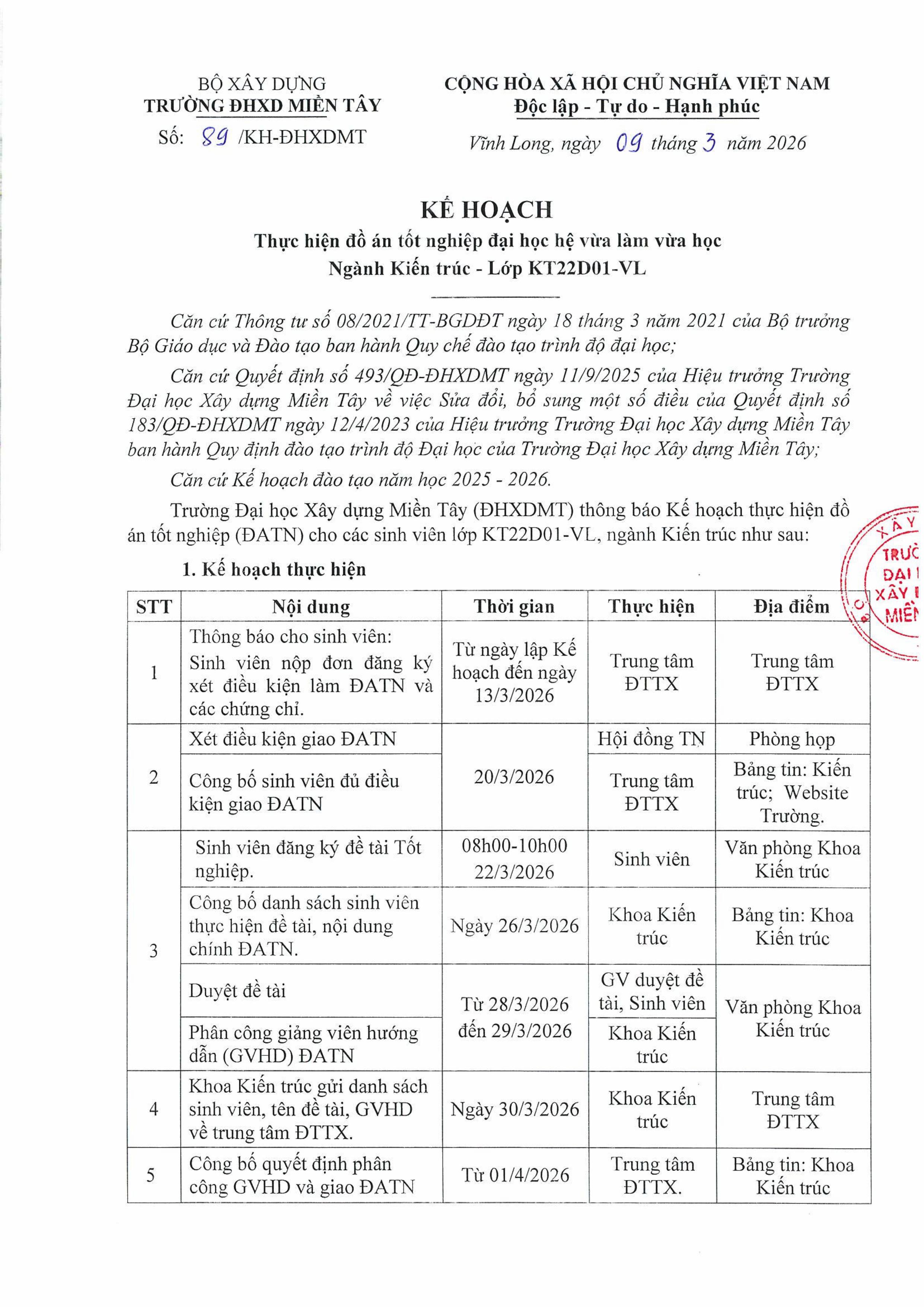 Kế hoạch thực hiện đồ án tốt nghiệp đại học hệ Vừa làm vừa học ngành Kiến trúc (KT22D01-VL)