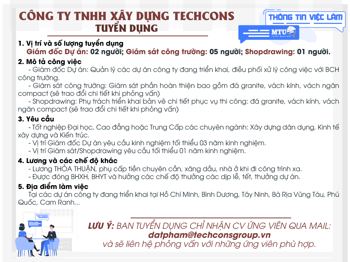 Công ty TNHH Xây dựng Techcons tuyển dụng