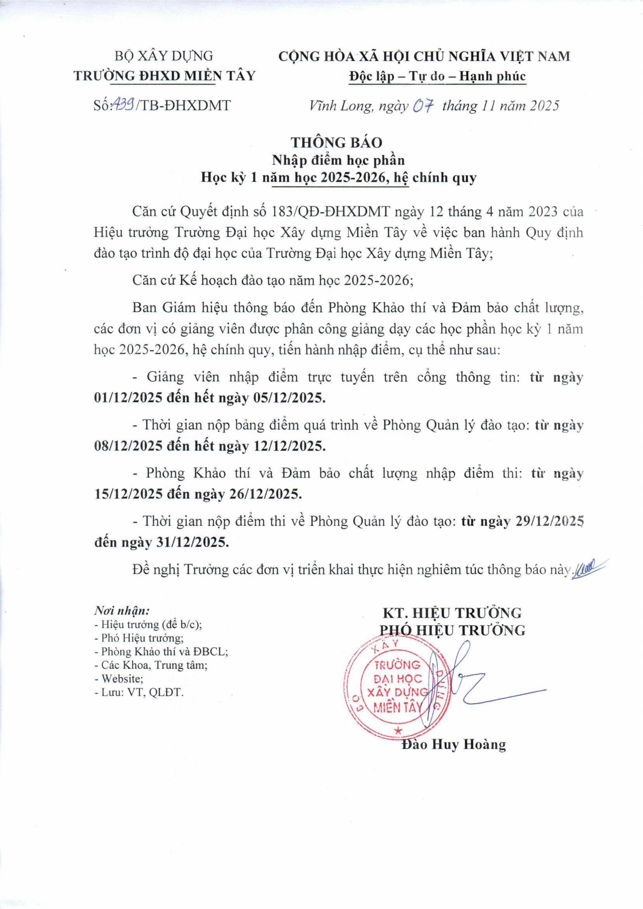 Thông báo nhập điểm học phần Học kỳ 1 năm học 2025-2026, hệ chính quy
