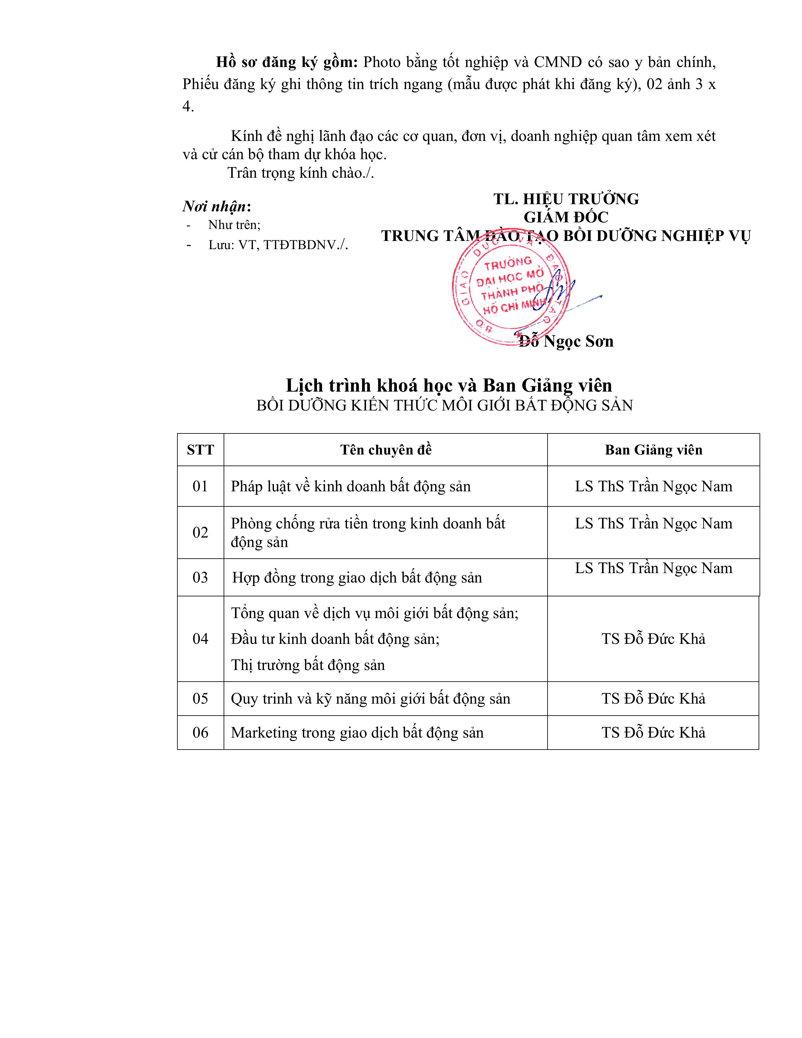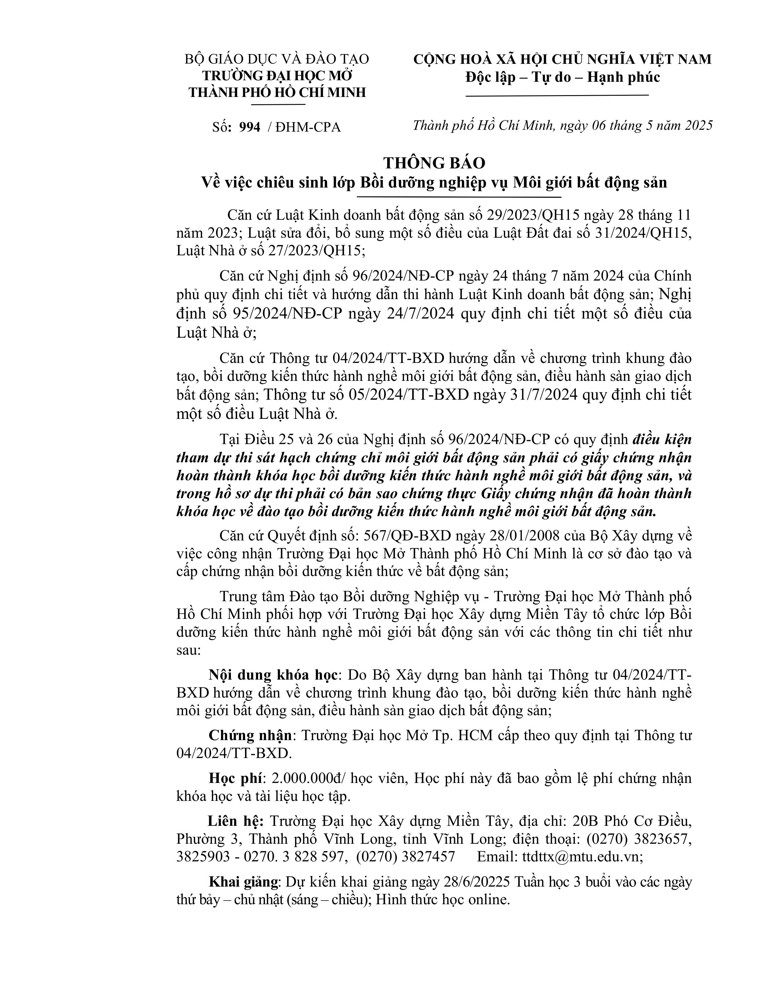 Thông báo về việc Chiêu sinh lớp Bồi dưỡng nghiệp vụ Môi giới bất động sản