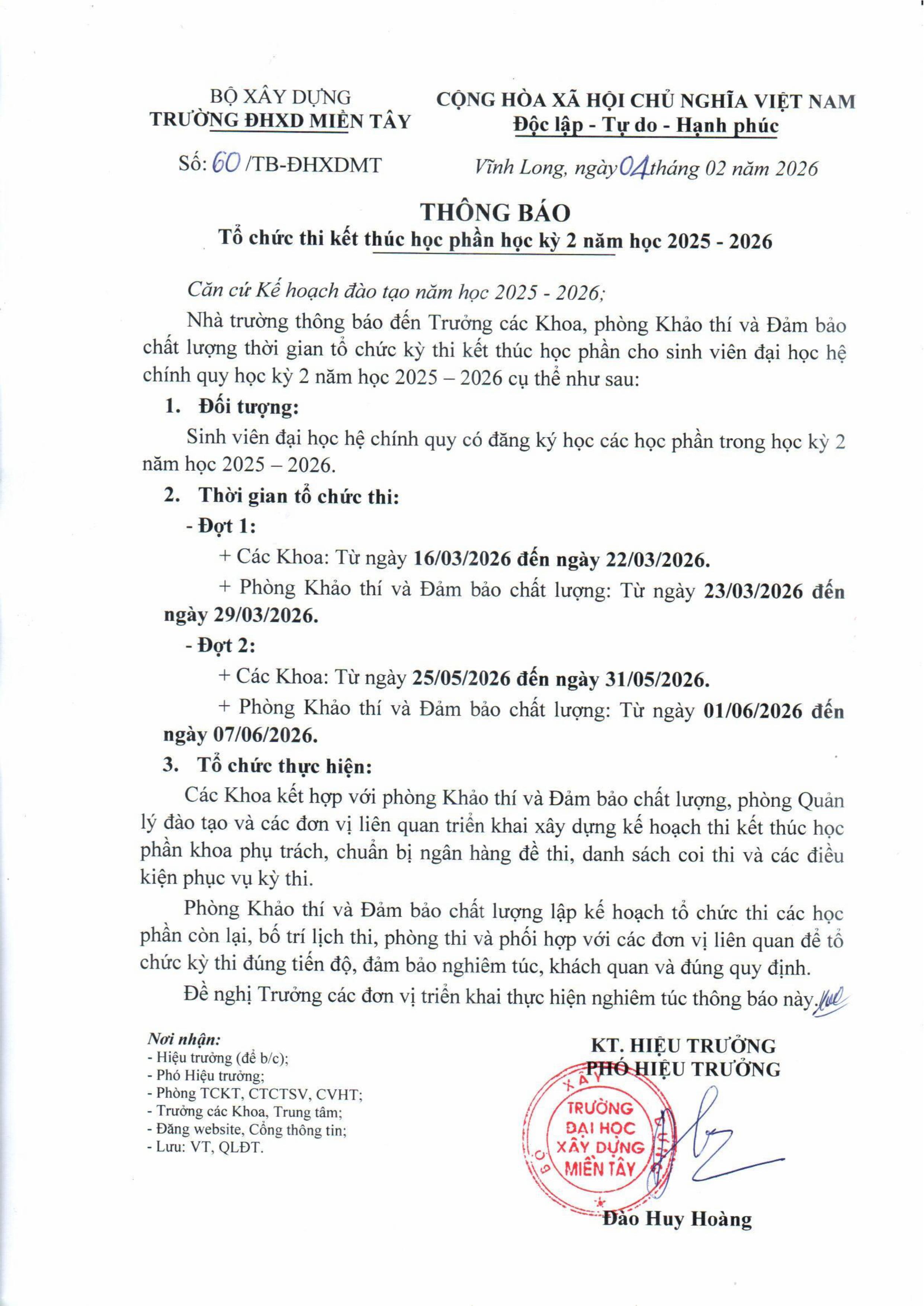 Thông báo Tổ chức thi kết thúc học phần học kỳ 2 năm học 2025 - 2026