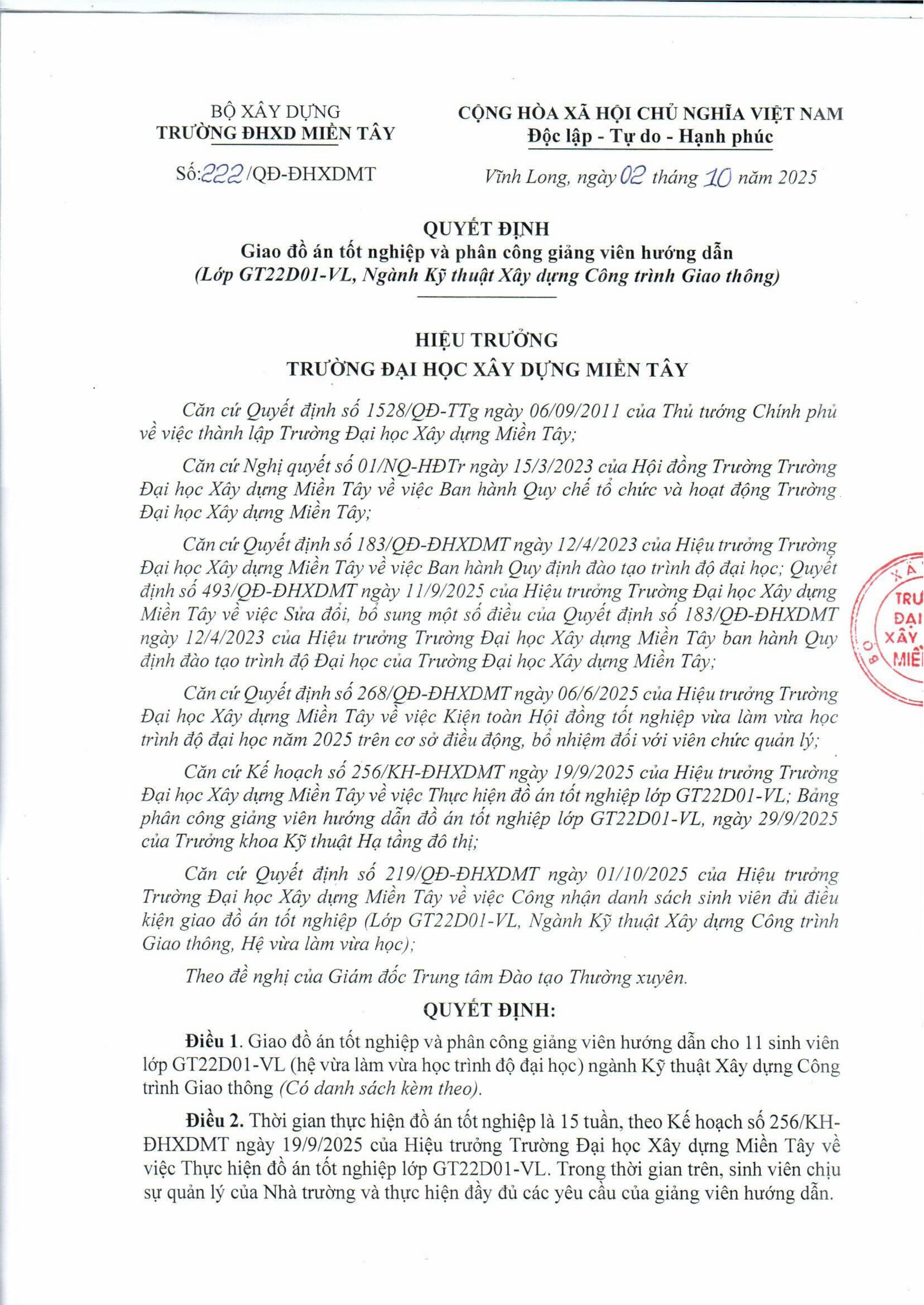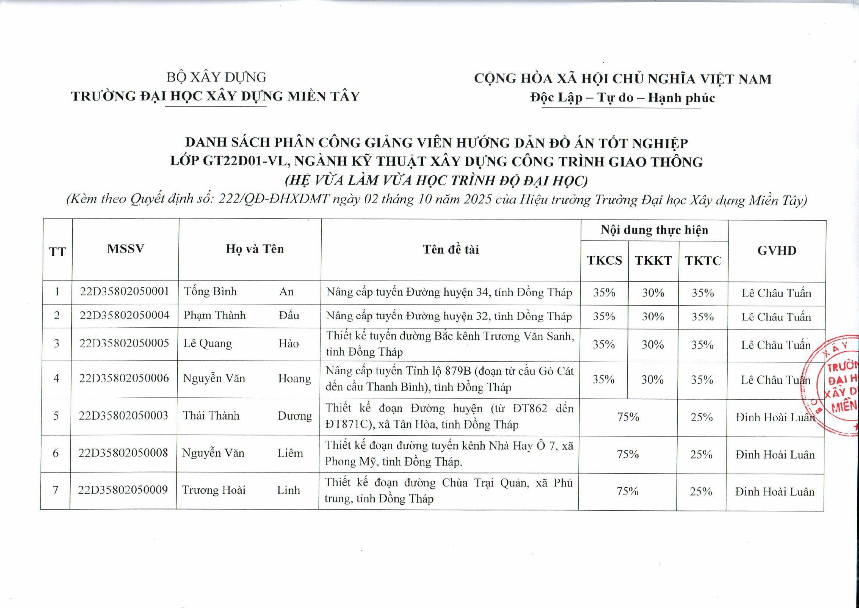 Giao đồ án tốt nghiệp và phân công giảng viên hướng dẫn (Lớp GT22D01-VL, Ngành Kỹ thuật Xây dựng Công trình Giao thông)