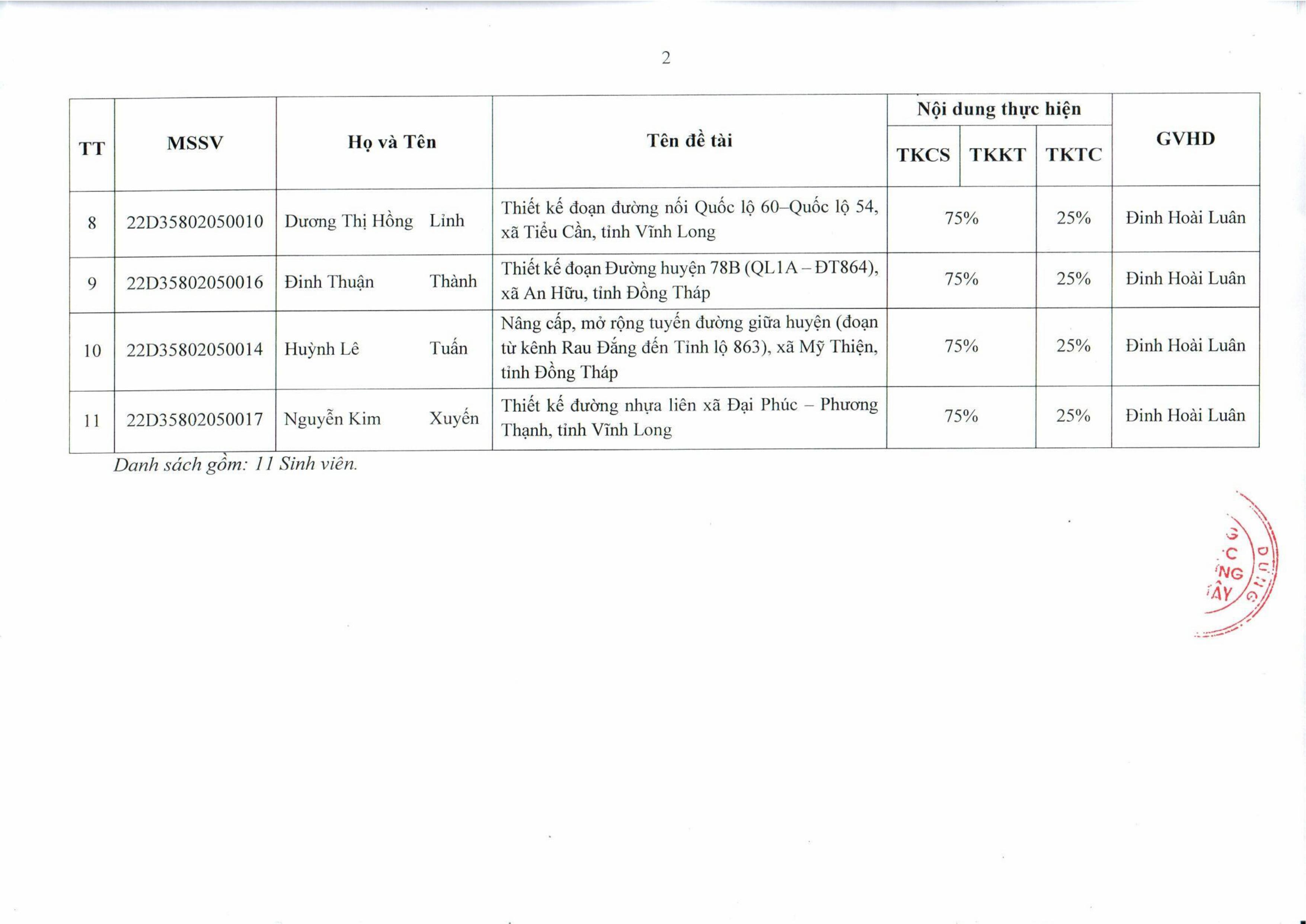 Công nhận danh sách sinh viên đủ điều kiện giao đồ án tốt nghiệp (Lớp GT22D01-VL, Ngành Kỹ thuật Xây dựng Công trình Giao thông)