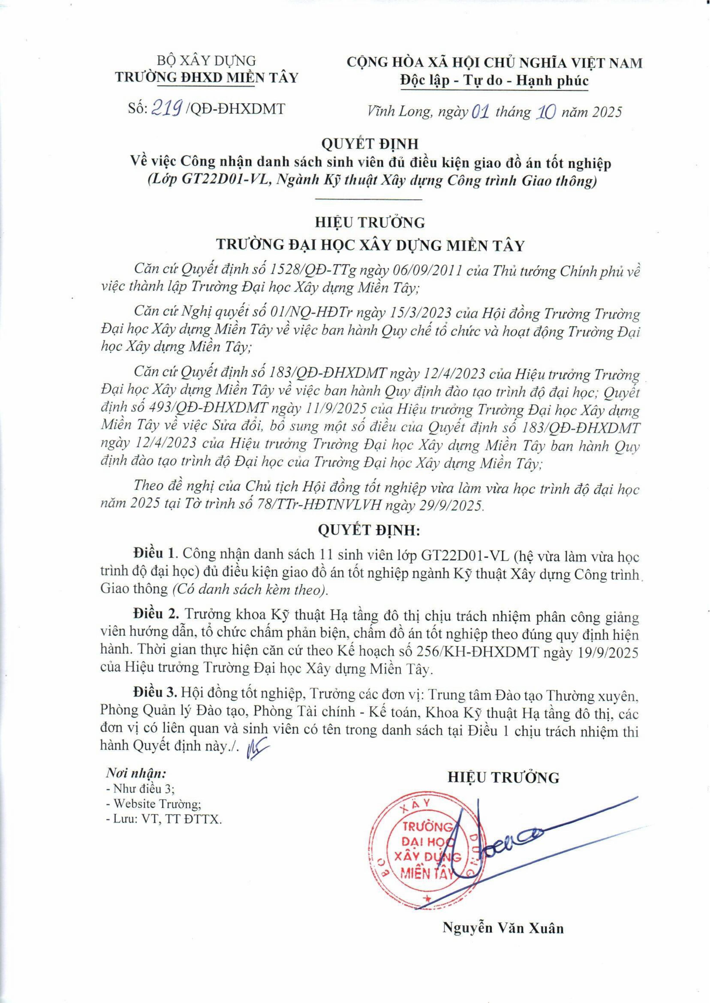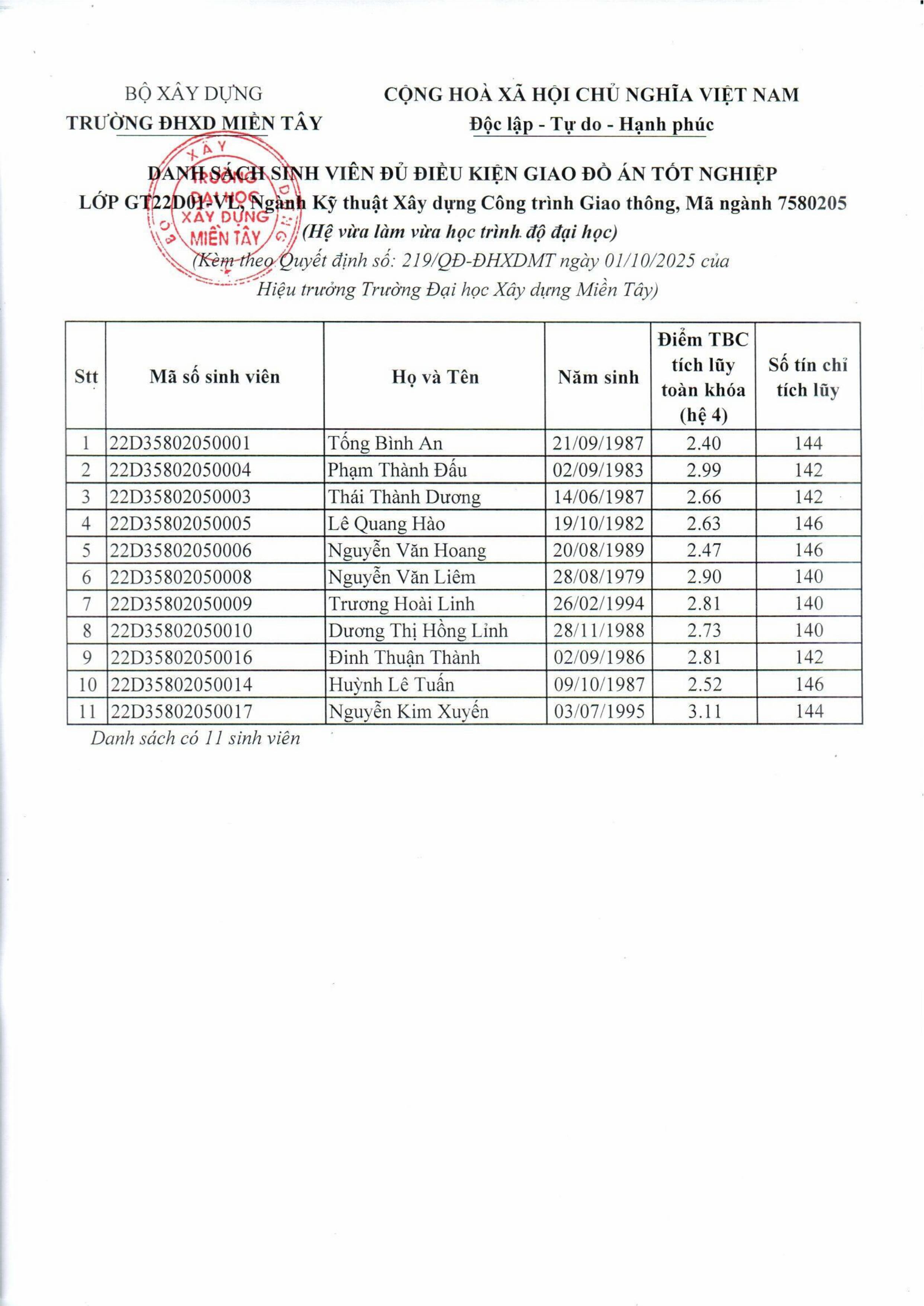 Công nhận danh sách sinh viên đủ điều kiện giao đồ án tốt nghiệp (Lớp GT22D01-VL, Ngành Kỹ thuật Xây dựng Công trình Giao thông)