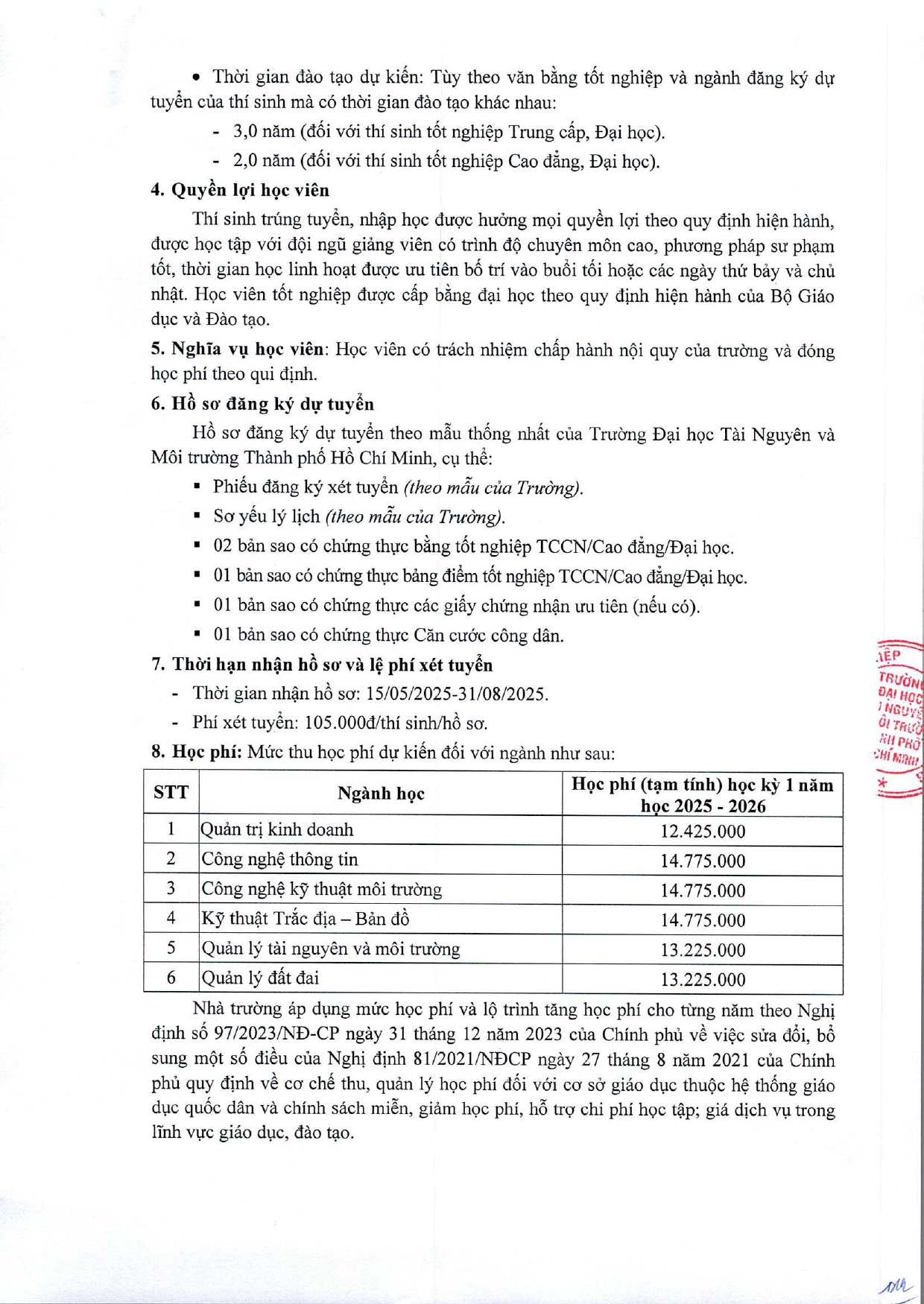 Trường Đại học Tài nguyên và Môi trường TP.HCM thông báo xét tuyển sinh đại học hình thức vừa làm vừa học năm 2025 liên kết đào tạo với Trường ĐHXD Miền Tây