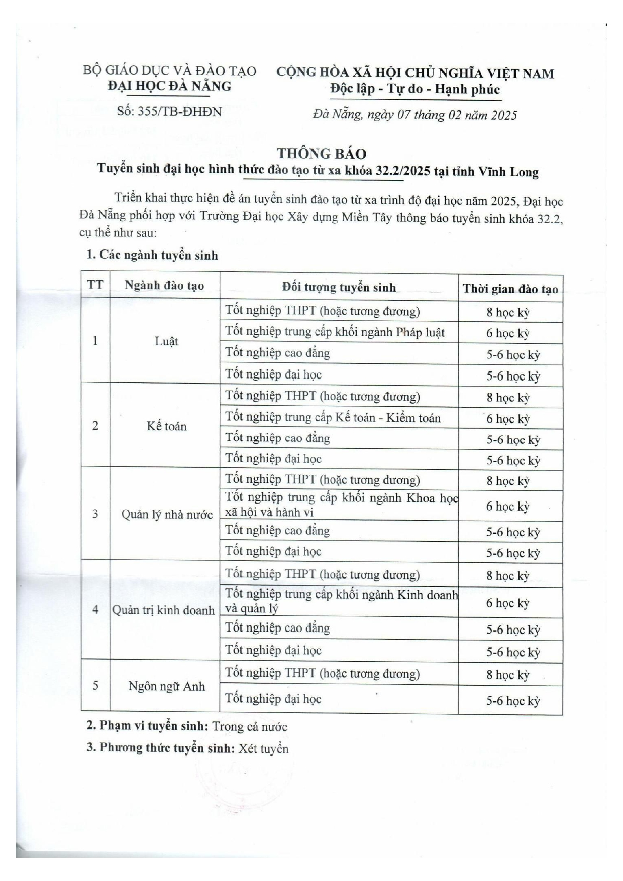 Đại học Đà Nẵng Thông báo tuyển sinh đại học hình thức đào tạo từ xa khóa 32.2/2025 tại tỉnh Vĩnh Long