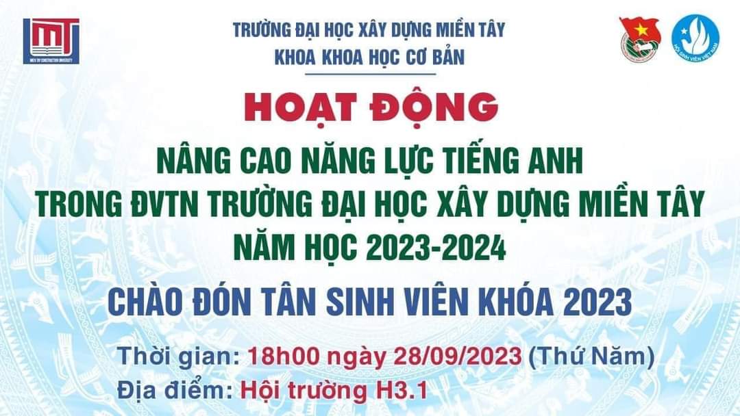 Bộ môn Ngoại ngữ, Khoa Khoa học Cơ bản phối hợp với Đoàn trường ĐHXD Miền Tây tổ chức hoạt động nâng cao năng lực tiếng Anh chào đón Tân Sinh viên khoá 2023 vào Thứ 5 (28/9/2023) 18h00 tại Hội trường H3.1 với nhiều quà tặng hấp dẫn, trò chơi vui nhộn, hoạt động nâng cao khả năng Nói tiếng Anh cùng các tiết mục văn nghệ đặc sắc.