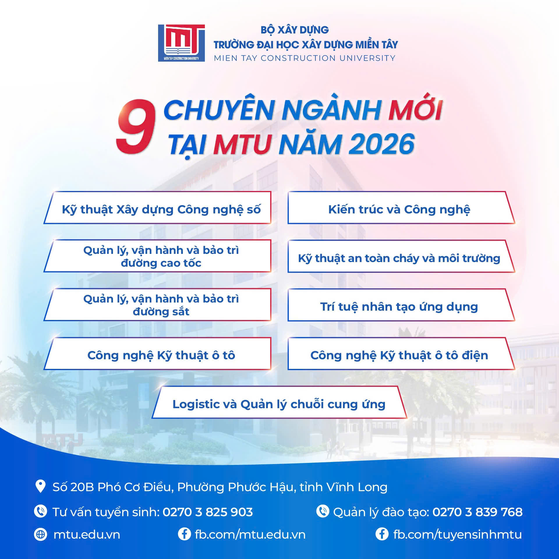 Nhằm đáp ứng xu hướng phát triển của xã hội và hòa cùng nhịp chuyển mình mạnh mẽ của đất nước, năm 2026, Trường Đại học Xây dựng Miền Tây tuyển sinh 1.020 chỉ tiêu với 11 ngành và 28 chuyên ngành đào tạo. Trong đó, có 9 ngành và chuyên ngành mới, mang đến nhiều cơ hội học tập đa dạng cho học sinh khu vực Đồng bằng sông Cửu Long.