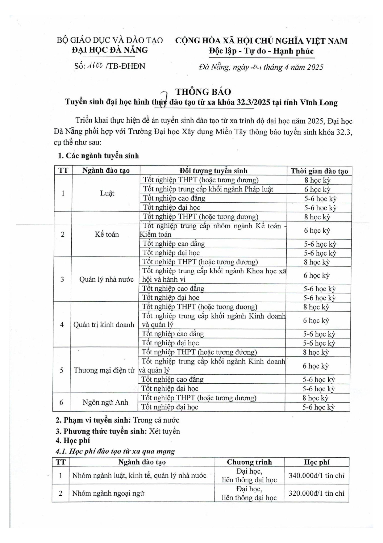 Đại học Đà Nẵng Thông báo tuyển sinh đại học hình thức đào tạo từ xa khóa 32.2/2025 tại tỉnh Vĩnh Long